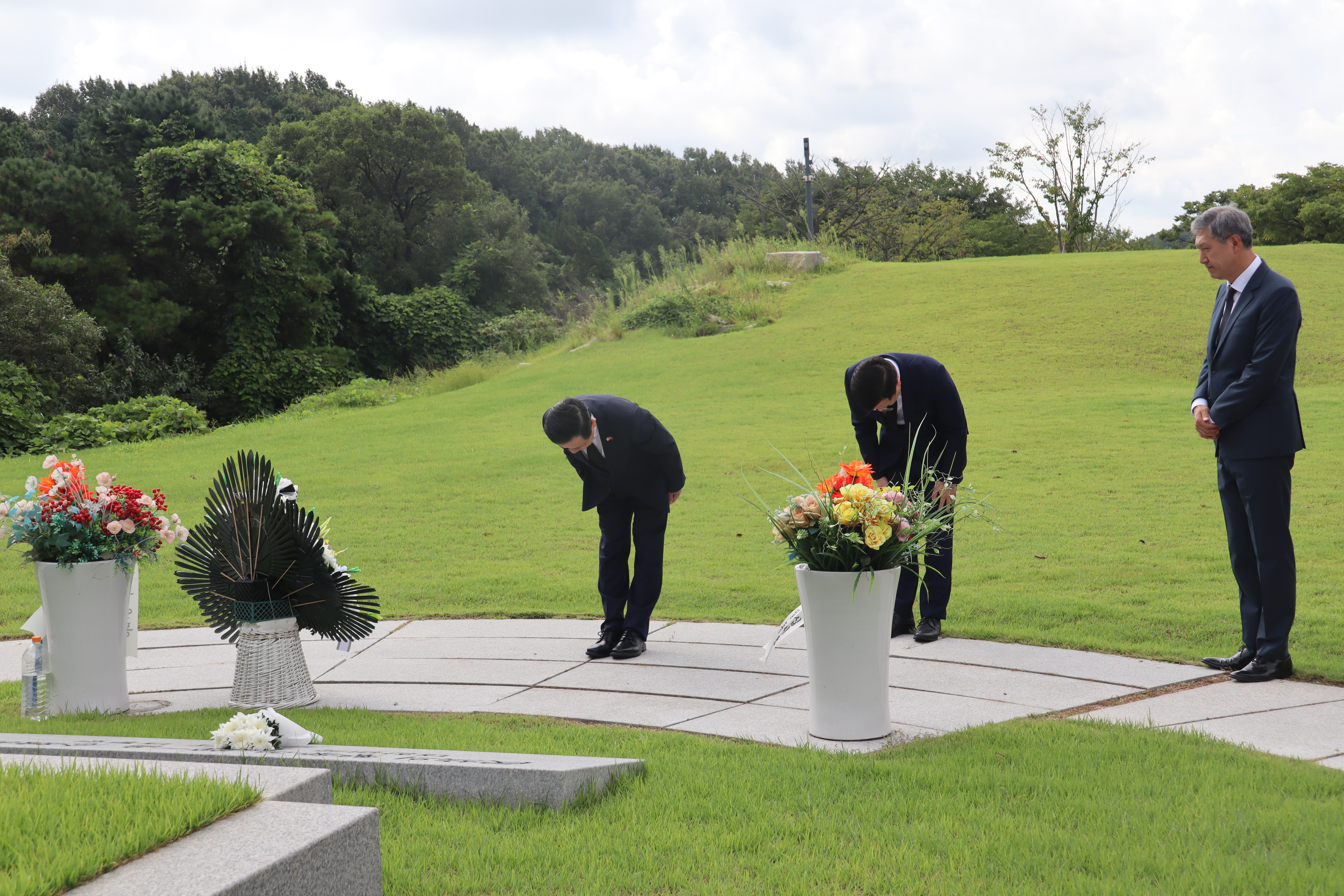 이 자리에는 노재헌 보통사람들의시대 노태우센터 상임이사가 묘역에 먼저 도착해 다이빙 대사 일행을 맞이하고 감사 인사를 전했다.